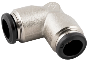 90 Degree Push-Connect Union Elbow Fitting, 10mm Tube, Nickel Plated Brass w/Poly CollarSpecifications: