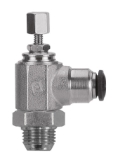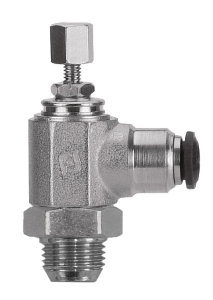 Right Angle Flow Control, Meter In, Knob Adjust, 6mm Tube x 1/4" PTF Male Thread, Nickel Plated Brass, Poly CollarSpecifications: