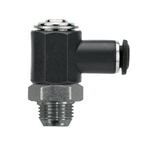Right Angle Flow Control, Meter Out, Screwdriver Adjust, 4mm Tube x 1/8" PTF Male Thread, Nickel Plated Brass Stem, Glass Filled Nylon BodySpecifications: