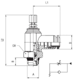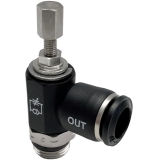 Right Angle Flow Control, Meter In, Screwdriver Adjust, 6mm Tube x M5 Metric Male Thread, Nickel Plated Brass Stem, Glass Filled Nylon BodySpecifications: